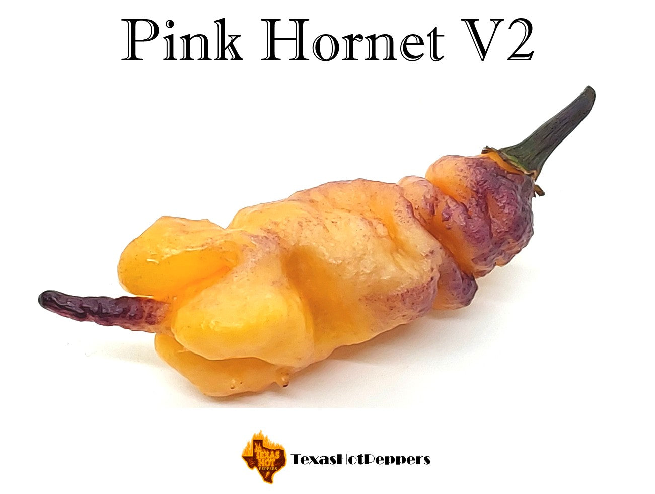 This 2nd phenotype of the Pink Hornet has incredible colors, a combination of pink, purple, orange and black mottling.  These differ from the first phenotype in that their is more orange coloring (and less pink) They are also a bit thinner and longer.  These are very hot! Also a huge yielder.